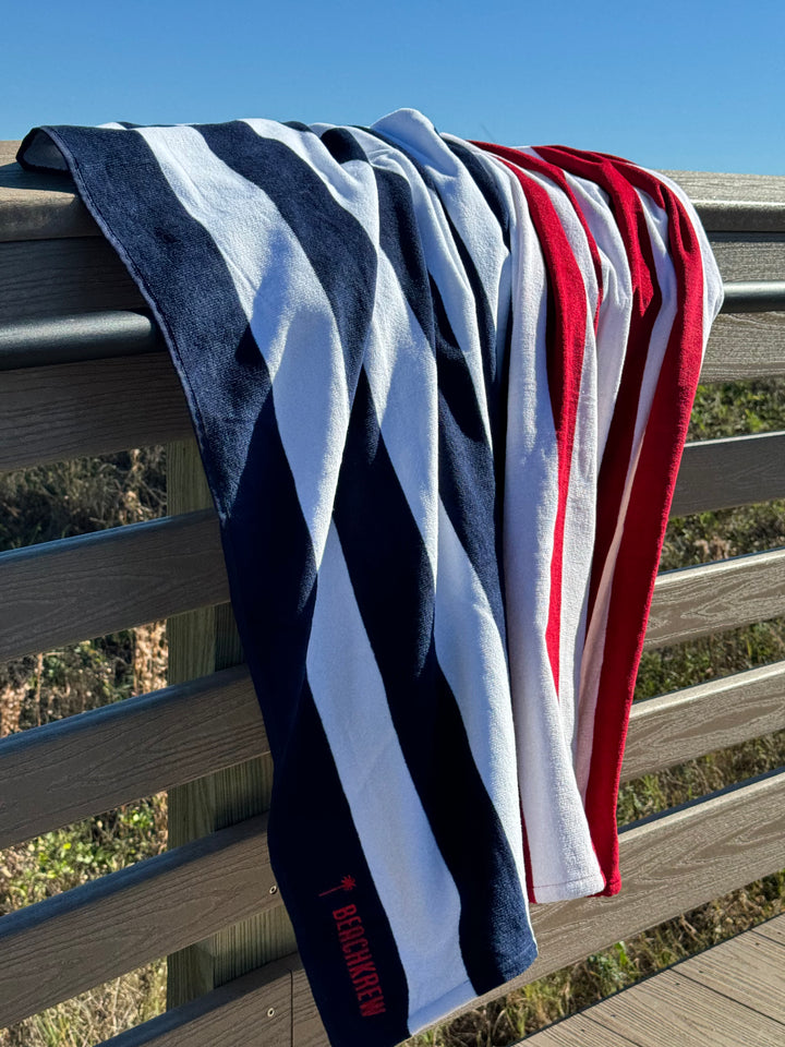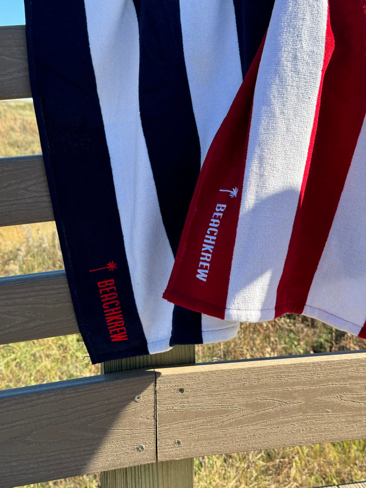 Featuring a red and white striped pattern, this towel adds a touch of fun to your beach setup. The chic navy Beachkrew embroidery adds an elegant finish, making it a standout accessory for any beachgoer.