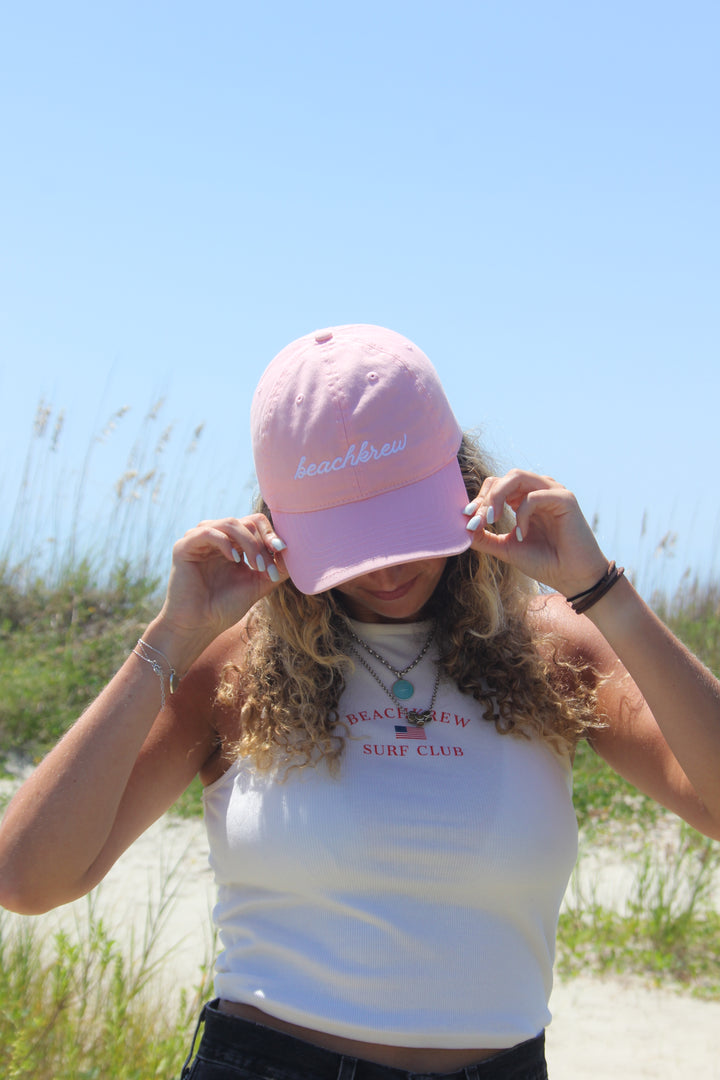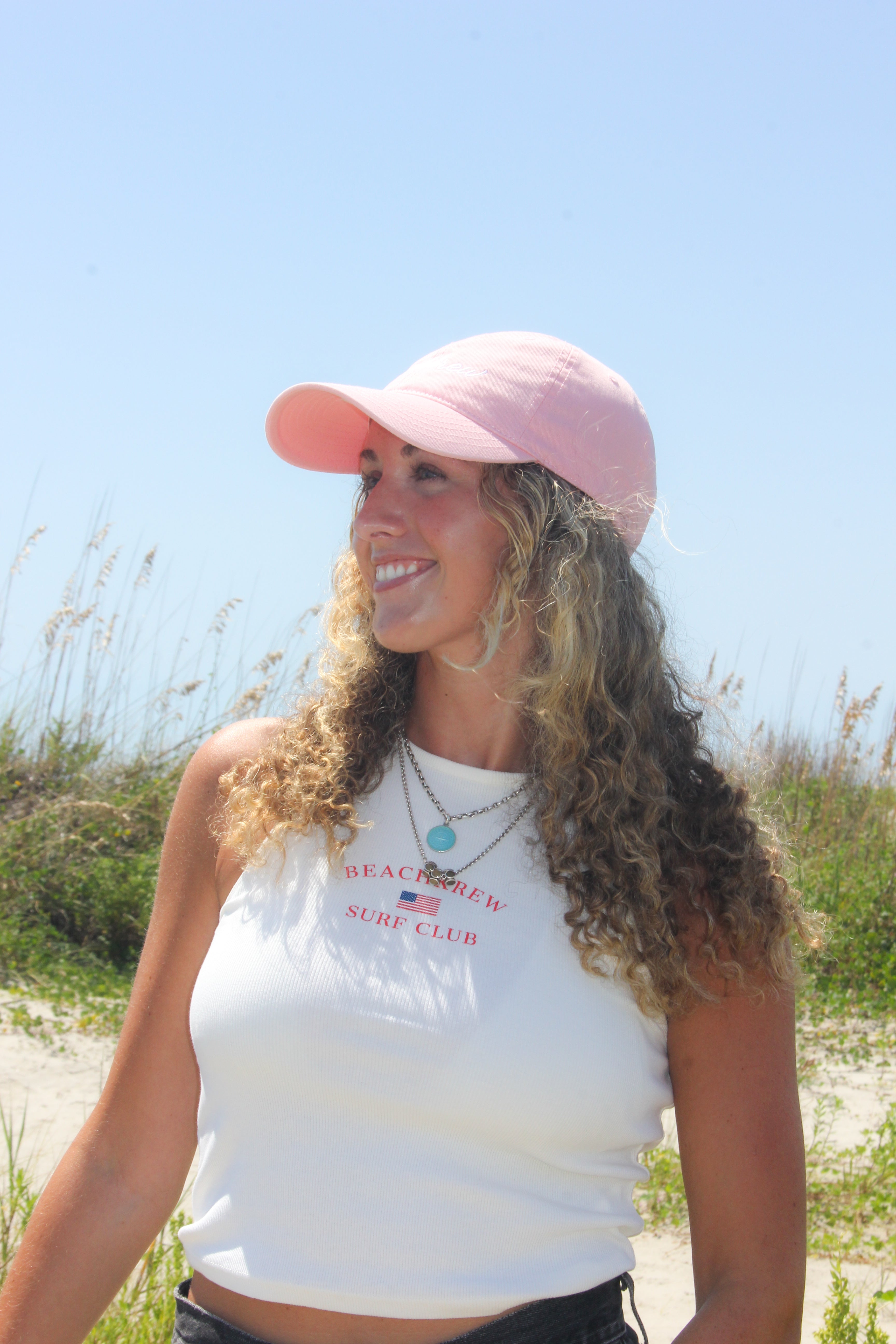 Featured in our six-panel dad cap. Unstructured, low profile, 100% cotton. Adjustable through metal press buckle.