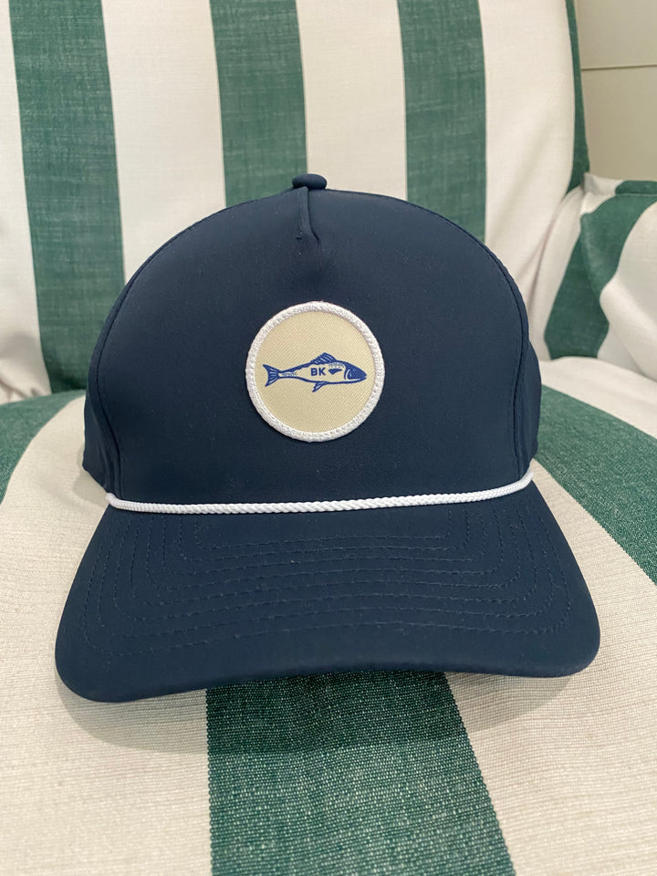 Featured in our five-panel hat with a rope along the front panel. Adjustable on back through snap closure.