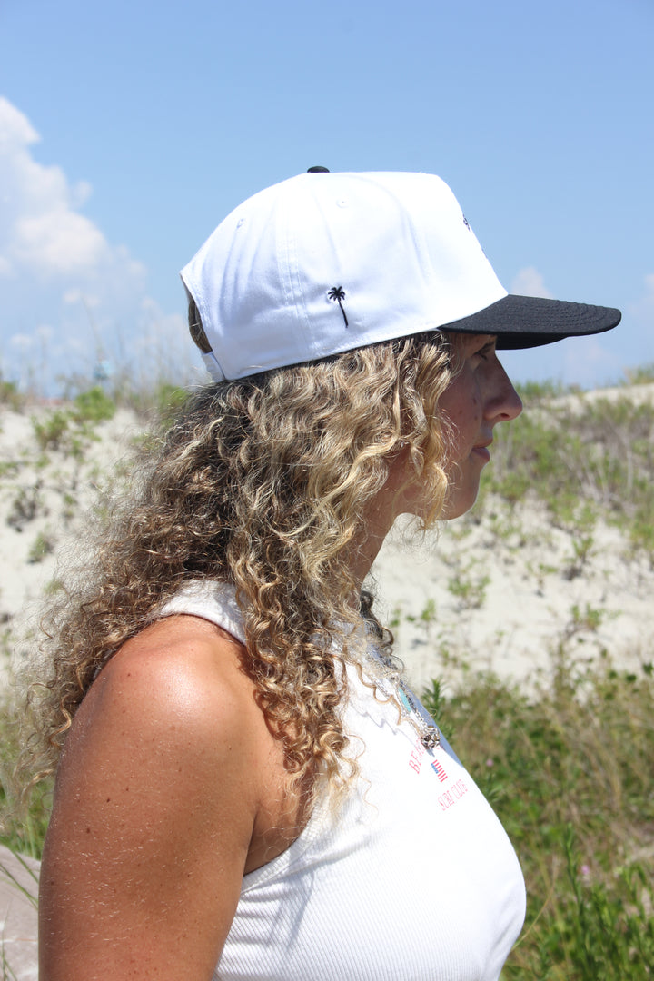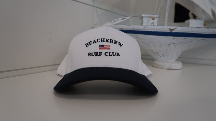 Made with a cotton twill blend of 65% Polyester 35%Cotton. Including a matching color sweatband & fabric under visor. 5 panel, mid profile cap, firm front panel. The two-tone look is a mix of a timeless style and beach vibes. Same fit as our fan-favorite Beachkrew Varsity Hat