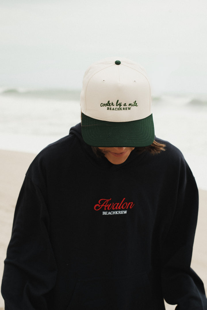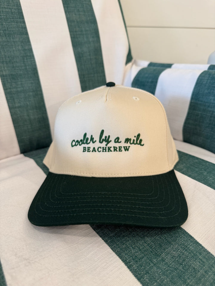 Beachkrew's classic signature hat. Made with a cotton twill blend of 65% Polyester 35% Cotton. Including a matching color sweatband & fabric under visor. 5 panel, mid profile cap, firm front panel. Embroidered "cooler by a mile" and Beachkrew along the front of the hat.