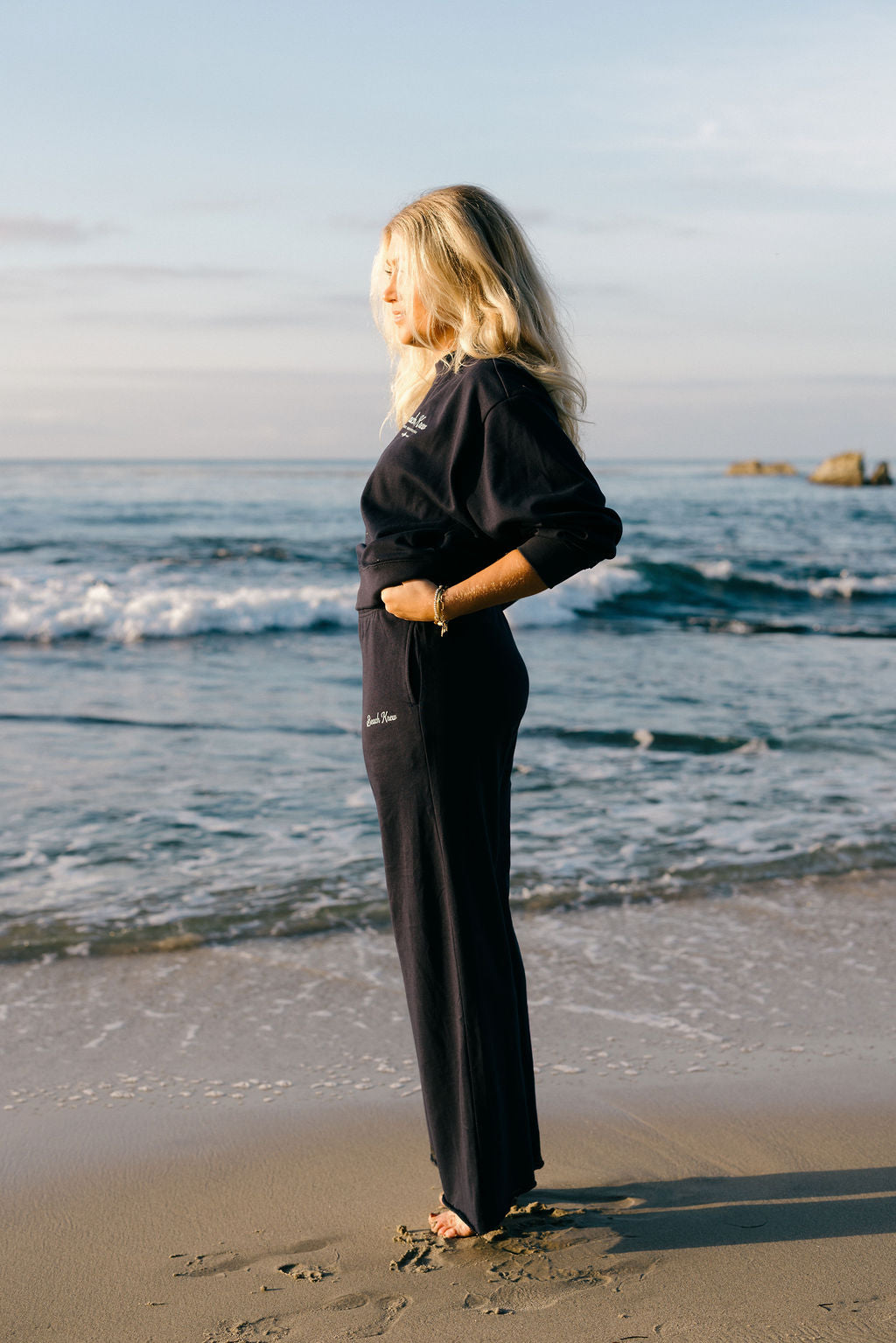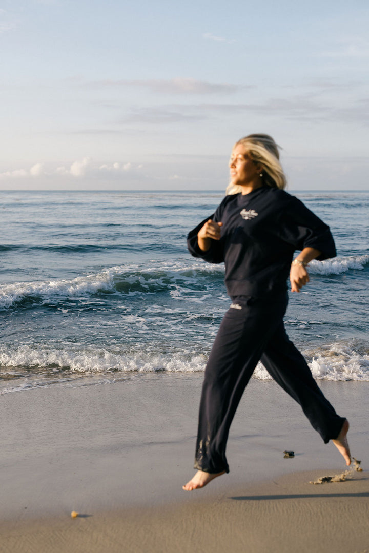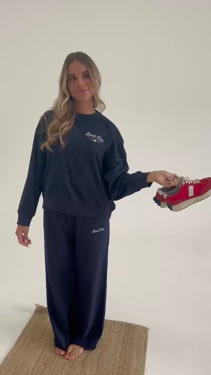 The New BeachKrew Terry Wide Legs in Jetty—a nautical navy. Part of our Hertiage Series Collection, these pants are made from a premium 60% cotton / 40% polyester French Terry. This is your go-to layer for all things coastal— light enough for warm summer days, and just right for layering in the off season. Runs TTS with a 12.5" Rise. Models are in M.