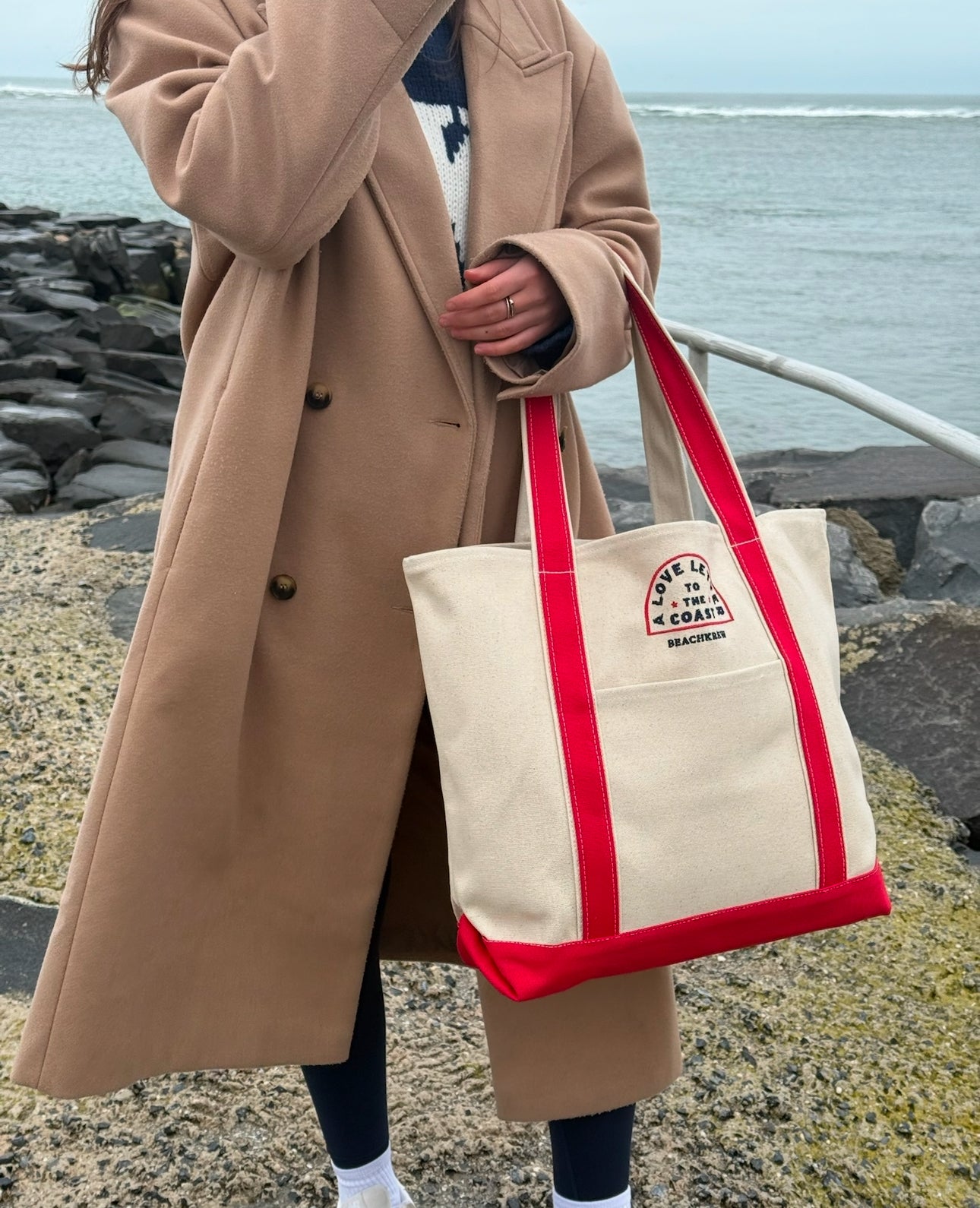 Introducing our Natural and Red XL Boater Bag, featuring the embroidered "A Love Letter to the Coast" above the pocket. This limited edition bag combines style and functionality, offering plenty of space for all your essentials. We're excited to share this exclusive design as part of our small drop—available in very limited quantities, so don't miss out! Complete the look with "A Love Letter to the Coast" TRUCKER HAT!
