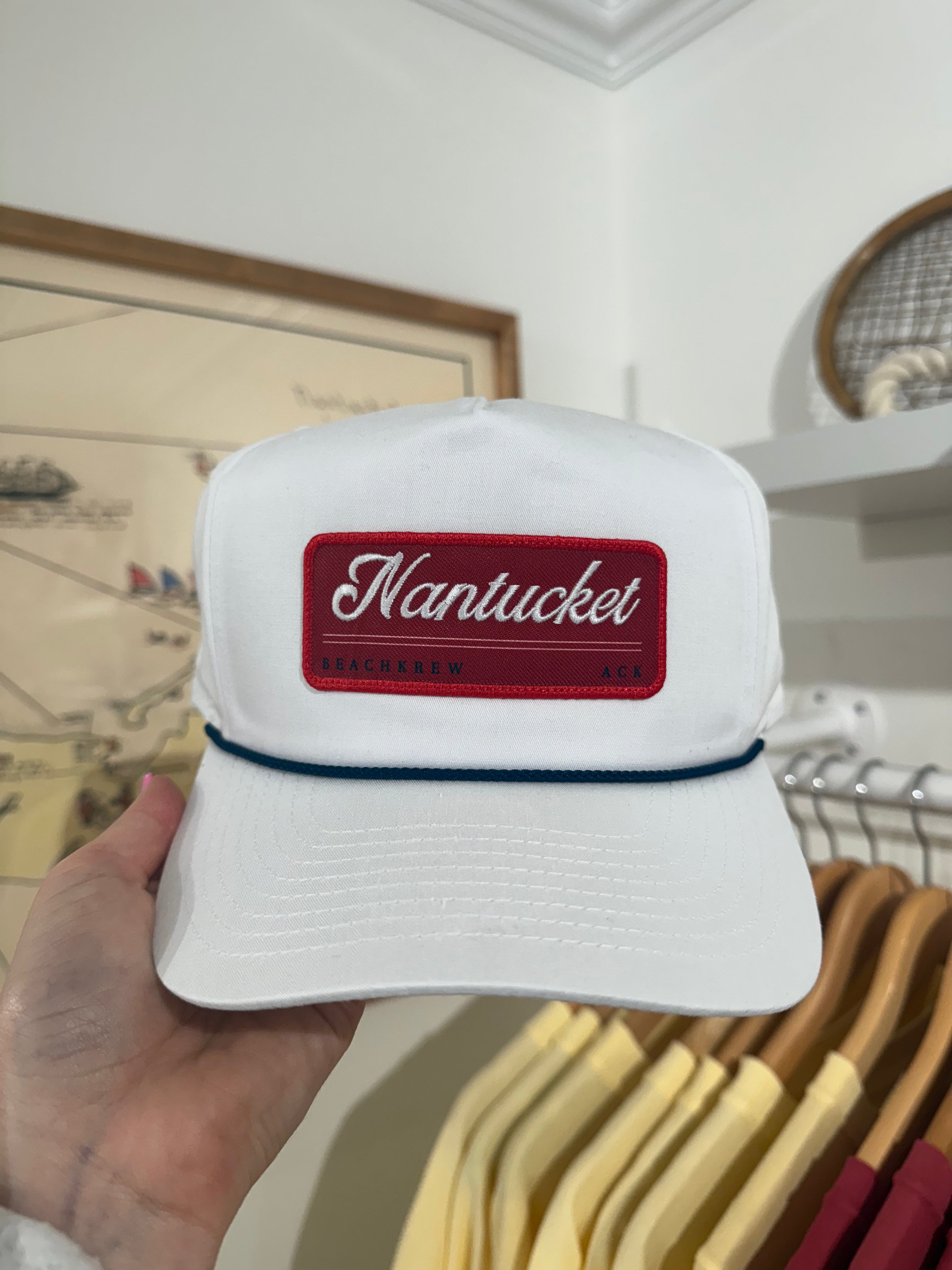 Featured in our five-panel hat with a rope along the front panel. Adjustable on back through snap closure. Nantucket Beachkrew ACK Patch / Navy Rope Across Front.