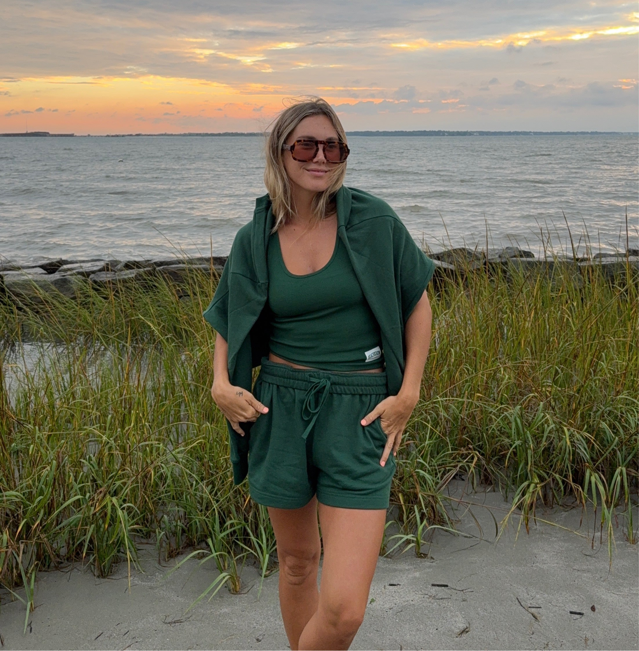 92% cotton / 8% Spandex blend for all-day comfort and stretch. This women’s-fit ribbed scoop neck tank in Seagrass—a deep, earthy green that’s perfect for fall.